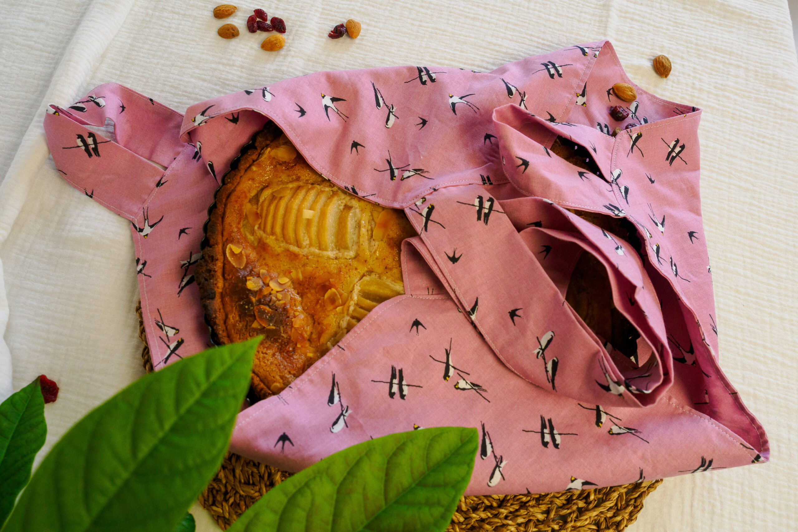 Sculpté dans l’étreinte artisanale de ma créatrice dans un tissu 100% coton certifié OEKO-TEX®, je suis le gardien nomade des délices sucrés et salés. Mes coutures, tissées d’amour et de patience, enlacent vos créations avec délicatesse. Qu’il s’agisse de tartes aux fruits ensoleillés, de quiches dorées ou de desserts étoilés, je les berce en mon sein, prêt pour l’aventure, protégeant leurs arômes et leur texture. Mes quatre anses, telles des ailes déployées, vous invitent au voyage, prêtes à s’envoler.